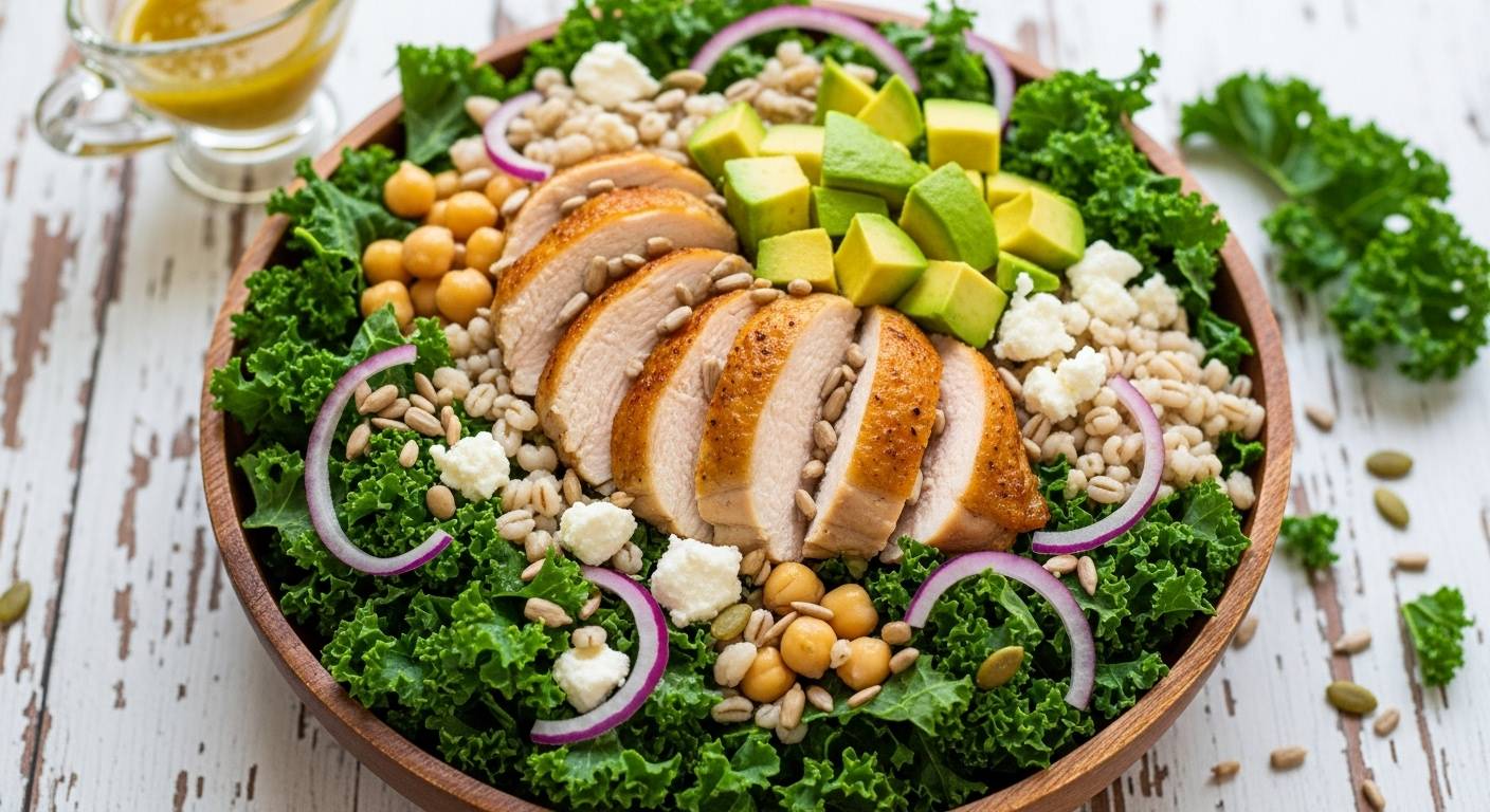 A fiber-rich, anti-inflammatory bowl designed for steady energy and easy prep. Chewy barley, massaged kale, chickpeas, and a bright lemon vinaigrette pair well with salmon, chicken, or your protein of choice.